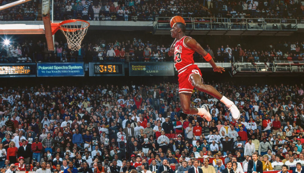 El 6 de febrero de 1988, Michael Jordan, de los Chicago Bulls, hizo su icónico mate desde la línea de tiros libres para convertirse en el ganador de uno de los mejores concursos de Slam Dunk de la NBA, superando a Dominique Wilkins de los Atlanta Hawks.