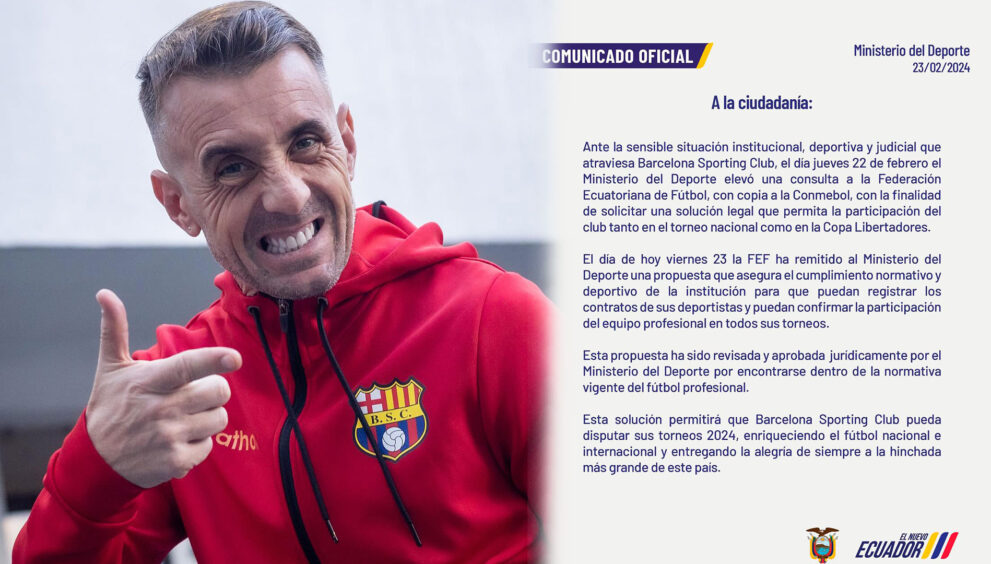 En la tarde del viernes 23 de febrero, el Ministerio del Deporte emitió un comunicado aclaratorio sobre la situación de Barcelona SC. Ante la compleja coyuntura institucional, deportiva y judicial que enfrenta el equipo ‘Torero’, se informó que el Ministerio elevó una consulta a la Federación Ecuatoriana de Fútbol (FEF), con copia a Conmebol. El propósito de esta acción es encontrar una solución legal que permita a Barcelona SC participar en la LigaPro y la Copa Libertadores en 2024 con todos sus refuerzos.