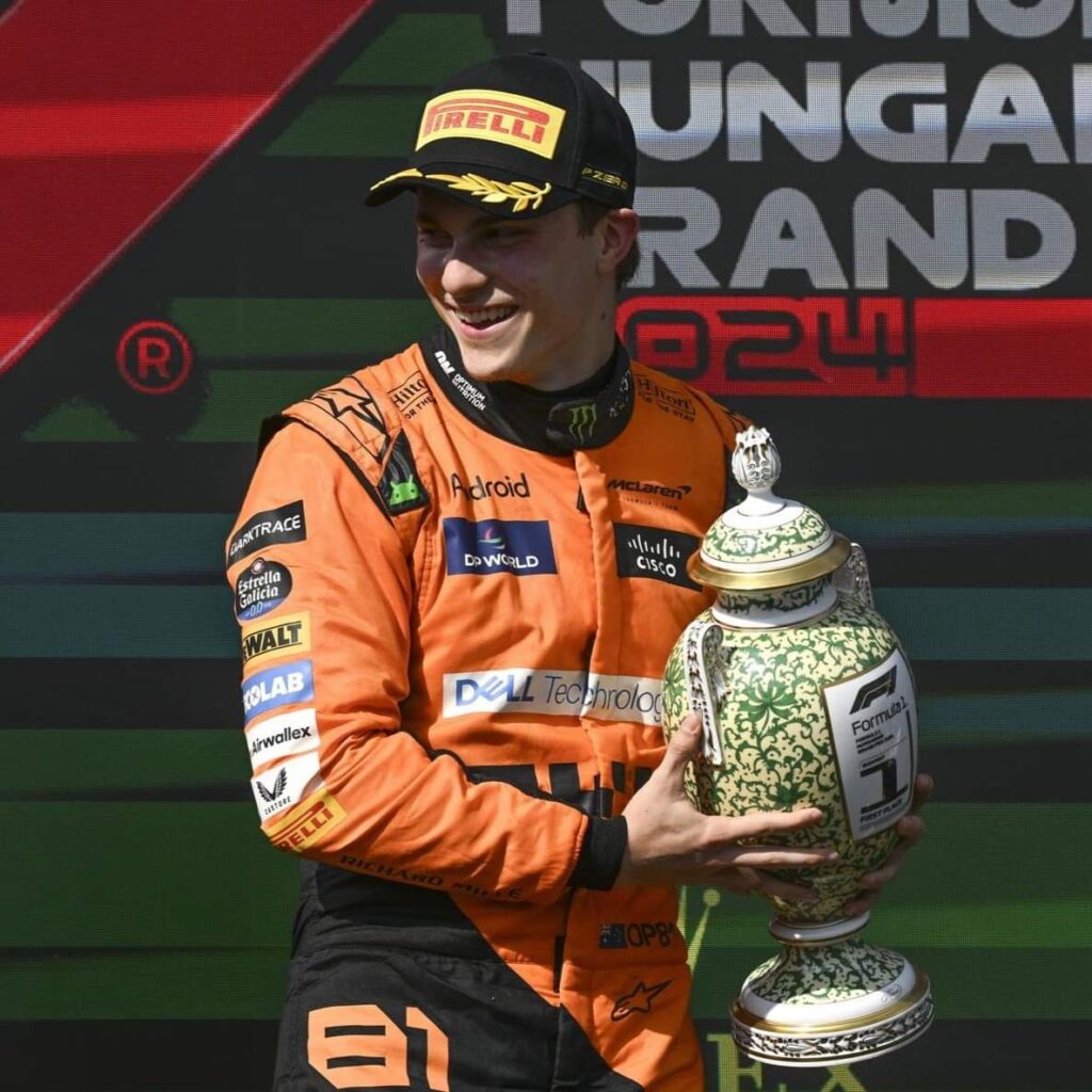 Oscar Piastri (McLaren) logró su primera victoria en la Fórmula 1 al ganar el Gran Premio de Hungría el 21 de julio de 2024, aprovechando la lucha entre su compañero Lando Norris y Max Verstappen (Red Bull).