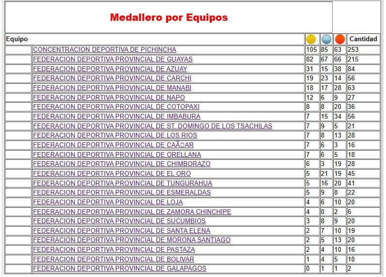 En segundo lugar se ubicó Guayas con 215 medallas —82 de oro, 67 de plata y 66 de bronce— y tercero Azuay con 84 preseas —31 de oro, 15 de plata y 38 de bronce—.