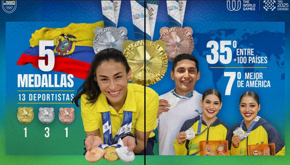 La delegación de Ecuador culminó una participación histórica en la XII edición de los Juegos Mundiales Chengdú 2025, que se desarrollaron del 7 al 17 de agosto en China. El país logró obtener cinco medallas: una de oro, tres de plata y una de bronce.